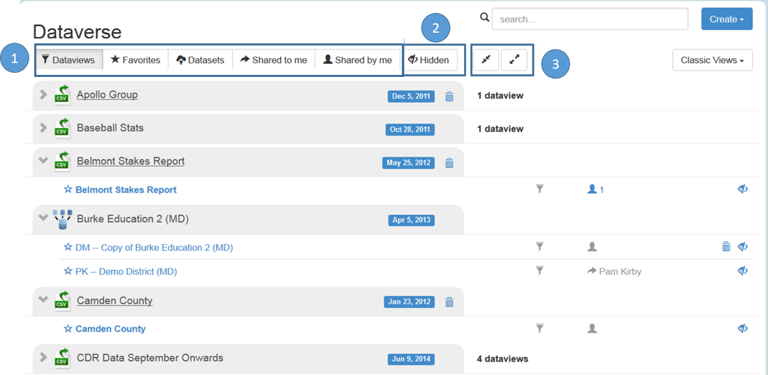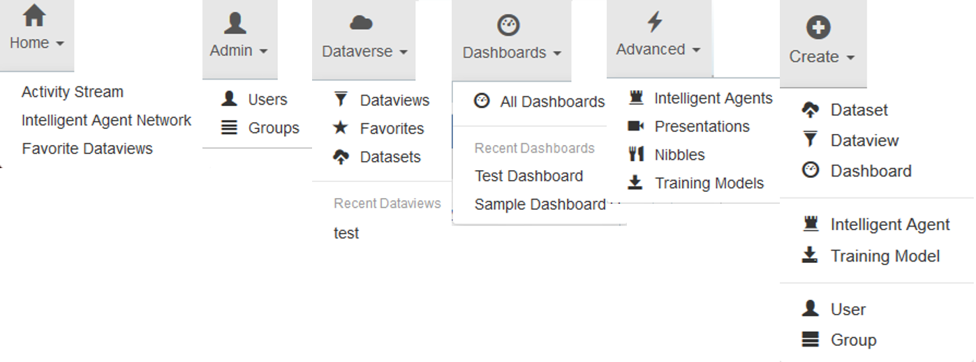 All menu options are now broken up into the: Home Menu, Admin Menu (for admin accounts only), Dataverse Menu, Dashboard Menu, Advanced Menu, and Create.
